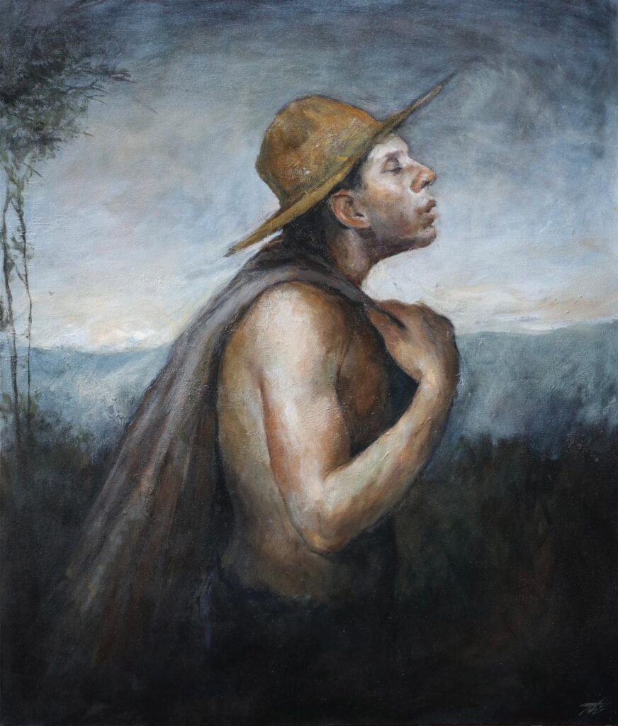Esta obra nace de mi interés por la leyenda del Silbón, una figura ancestral de los Llanos condenada a cargar un saco lleno de huesos. A través de ella busqué plasmar una serenidad misteriosa, presente en su gesto y el paisaje. El Silbón es conocido por su silbido engañoso: cuando parece escucharse cerca, en realidad está lejos; y cuando suena distante, es porque puede estar muy cerca.